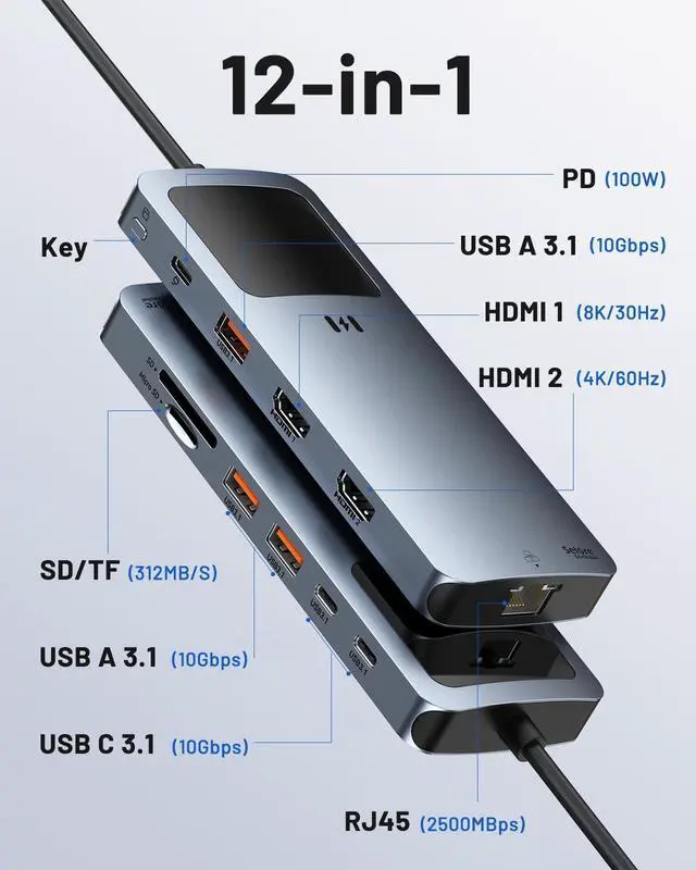 Speed Data Transfer: Docking station with 2 HDMI ports equipped with 2*USB C 3.1 ports & 3*USB A 3.1 ports ( up to 10Gbps) high-speed data transfer for lightning-quick file syncs. The integrated SD/TF boasting an incredible maximum read speed of 312MB/s and maximum write speed of 250MB/s. Whether youre transferring large files via an external hard drive or importing high-res photos/videos from your camera, this type c docking station drastically cuts down waiting time and boosts your workflow efficiency ^^ 100W
