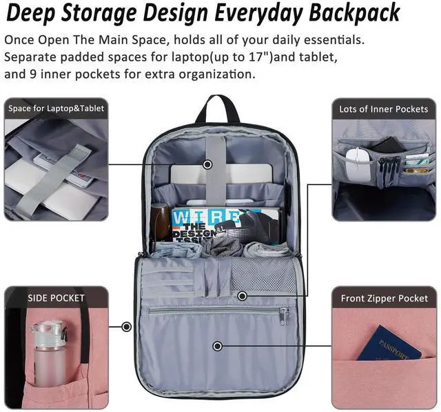 Laptop Backpack for Travel, Business and Work with Lots of Space&Pockets --- Separate laptop compartment that can accommodate laptops up to 17.3 inches, and large main space with more than 12 pockets can easily store books, wallets, clothes and other daily necessities. Multifunctional pockets in the main compartment can hold pens, cards, keys, etc. to keep your belongings in order. The external front zipper and two side pockets are also good choices for water bottle or umbrella.