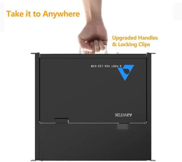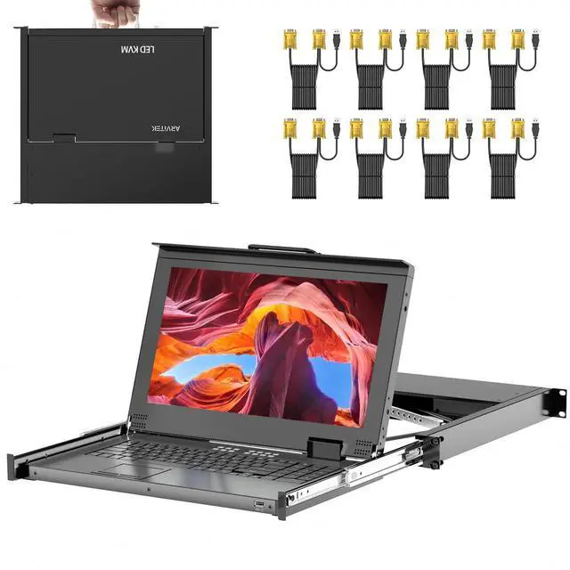 Arvitek 15.6" LCD KVM Console 8 Port allows you to control 8 computers sharing 15.6" screen at the same time. Supports 2-level daisy chain, control up to 64 computers.