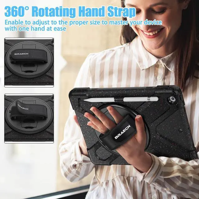 360deg Rotatable Stand + Adjustable Hand Strap: The Case for iPad 9th/8th/7th Generation Built-in kickstand for vertical & horizontal viewing (perfect for videos, reading, or meetings). Ergonomic hand strap fits all hand sizes (adults, kids, students)