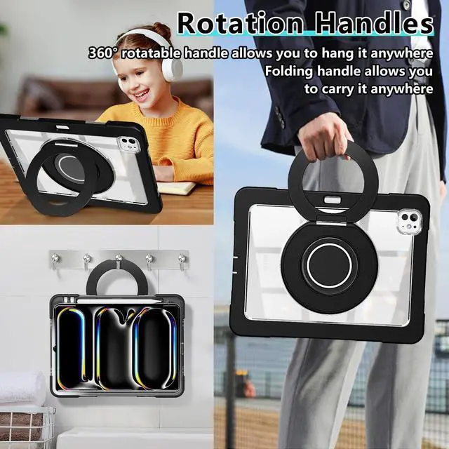 for iPad Pro 11 Inch Case 2024 5th Generation (M4) - with Pencil Holder/Screen Protector/Rotating Stand, Clear Slim Heavy Duty Shockproof Rugged Protective Cover for iPad Pro 11 5th Gen (Black)
