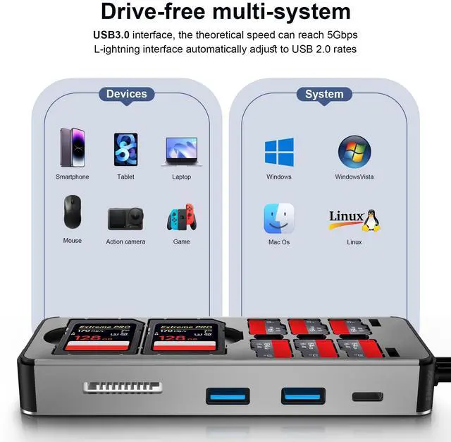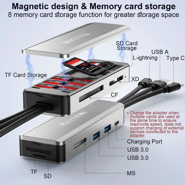 JOOPSHEE multi-function card reader is a powerful device that can read different types of memory cards on various devices: TF/SD/CF/MS/XD, support simultaneous reading and compatible with Windows/Mac operating system /Linux/iOS/OTG Android smart phone. **Charge the adapter when multiple cards are used at the same time to ensureread/write speed,does not support charging of external devices connected to the adapter.