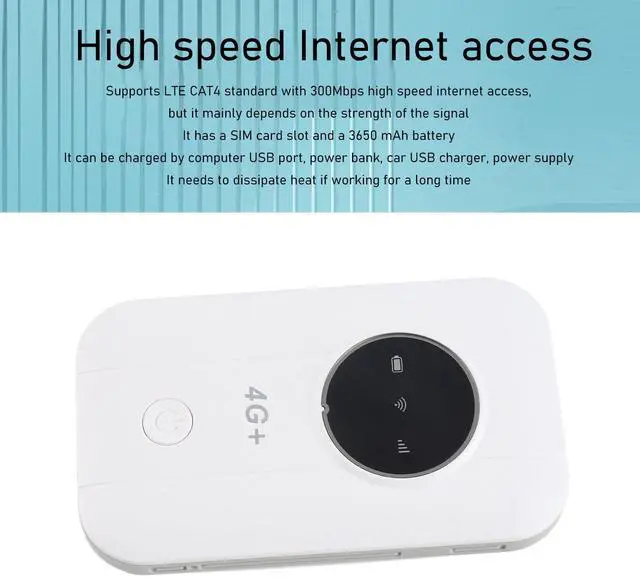 HIGH SPEED INTERNET: Supports LTE CAT4 standard, 300Mbps high speed Internet access, but it mainly depends on the strength of the . It has a SIM card slot and a 3650 mAh battery. It can work with external power supply, no working time limit. It can be charged via computer USB port, power bank, car USB charger, power supply. If it works for a long time, it needs to dissipate heat.