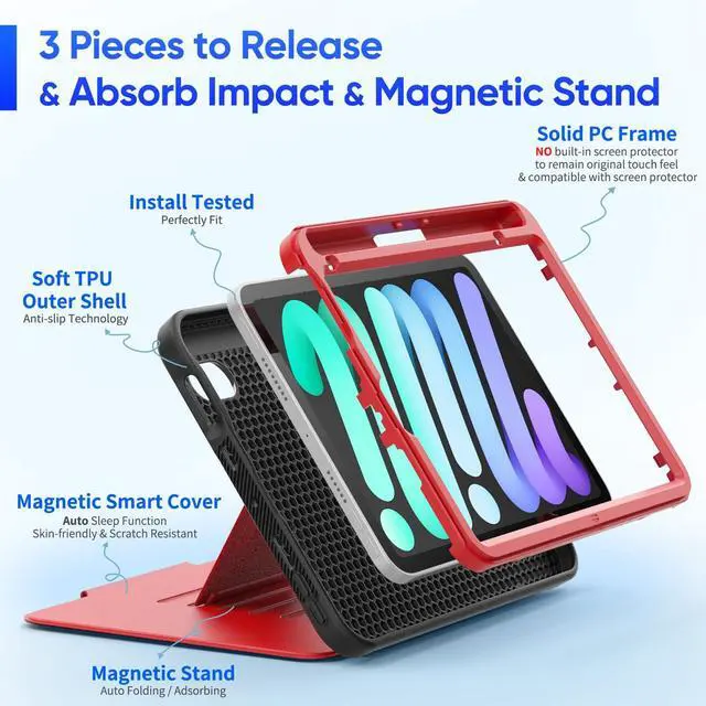 SEYMAC stock Case for iPad mini 7 (A17 Pro)/ Mini 6 8.3'', Strong Magnetic Auto Sleep Shockproof Case with Absorbing Multi-Angles Stand, Pen Holder, Card Slot, Red