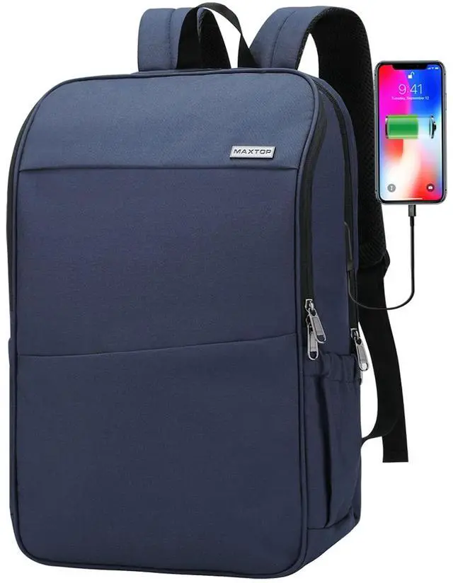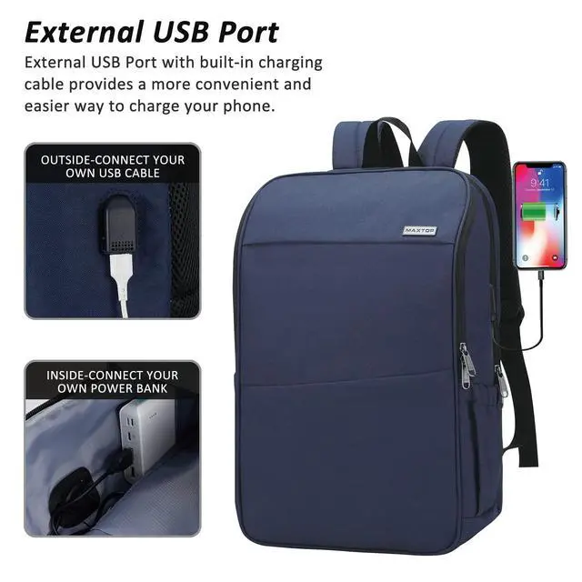 Laptop Backpack for Travel, Business and Work with Lots of Space&Pockets --- Separate laptop compartment that can accommodate laptops up to 17.3 inches, and large main space with more than 12 pockets can easily store books, wallets, clothes and other daily necessities. Multifunctional pockets in the main compartment can hold pens, cards, keys, etc. to keep your belongings in order. The external front zipper and two side pockets are also good choices for water bottle or umbrella. ^^ Creative USB Design with Detachable Cable&Inside Power Bank Pocket --- With built in USB charger outside and built in charging cable inside the book bag, you can charge your phone conveniently without opening up the computer backpack.