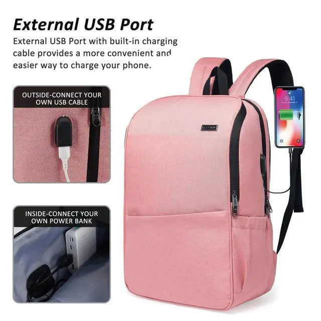 Laptop Backpack for Travel, Business and Work with Lots of Space&Pockets --- Separate laptop compartment that can accommodate laptops up to 18.4 inches, and large main space with more than 12 pockets can easily store books, wallets, clothes and other daily necessities. Multifunctional pockets in the main compartment can hold pens, cards, keys, etc. to keep your belongings in order. The external front zipper and two side pockets are also good choices for water bottle or umbrella. ^^ Creative USB Design with Detachable Cable&Inside Power Bank Pocket --- With built in USB charger outside and built in charging cable inside the book bag, you can charge your phone conveniently without opening up the computer backpack.