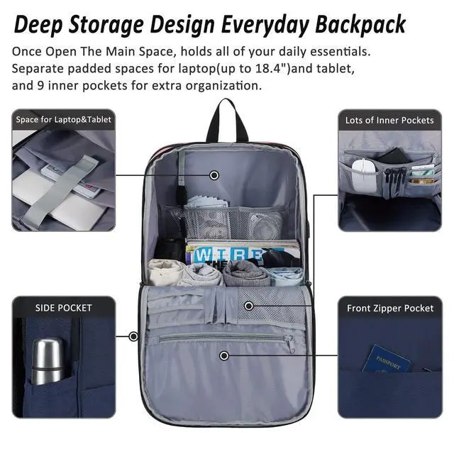 Laptop Backpack for Travel, Business and Work with Lots of Space&Pockets --- Separate laptop compartment that can accommodate laptops up to 18.4 inches, and large main space with more than 12 pockets can easily store books, wallets, clothes and other daily necessities. Multifunctional pockets in the main compartment can hold pens, cards, keys, etc. to keep your belongings in order. The external front zipper and two side pockets are also good choices for water bottle or umbrella. ^^ Creative USB Design with Detachable Cable&Inside Power Bank Pocket --- With built in USB charger outside and built in charging cable inside the book bag, you can charge your phone conveniently without opening up the computer backpack.