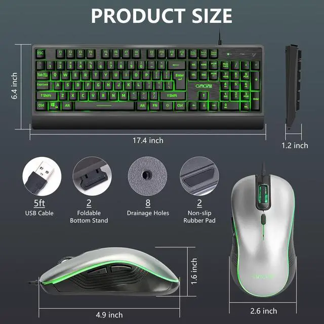 The wired gaming mouse works well on smooth surfaces and can be used for long periods without hand fatigue. Long press the DPI to turn off the gaming mouse light. ^^ Multimedia Shortcut Keys and BacklightThe computer keyboard with 12 multimedia shortcut keys providing instant access to music, volume, computer, email and more, this wired keyboard greatly improves work efficiency.