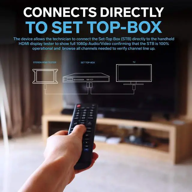 HD LCD DISPLAY- This HDMI tester provides the technician (or any user) with an HD LCD screen to check that the set-top box is installed correctly. This LCD display provides both audio and video display and also gives you the ability to do a 19-pin continuity check. Full Color Audio and Video Display ^^ Auto-Scale Resolutions ^^ ENSURE CABLING- Ensure that your set top box has been installed correctly with this HDMI tester. The technician (or any user) does not need a TV to ensure that the set-top box has been installed. You can also check the channel lineup with this HDMI tester.