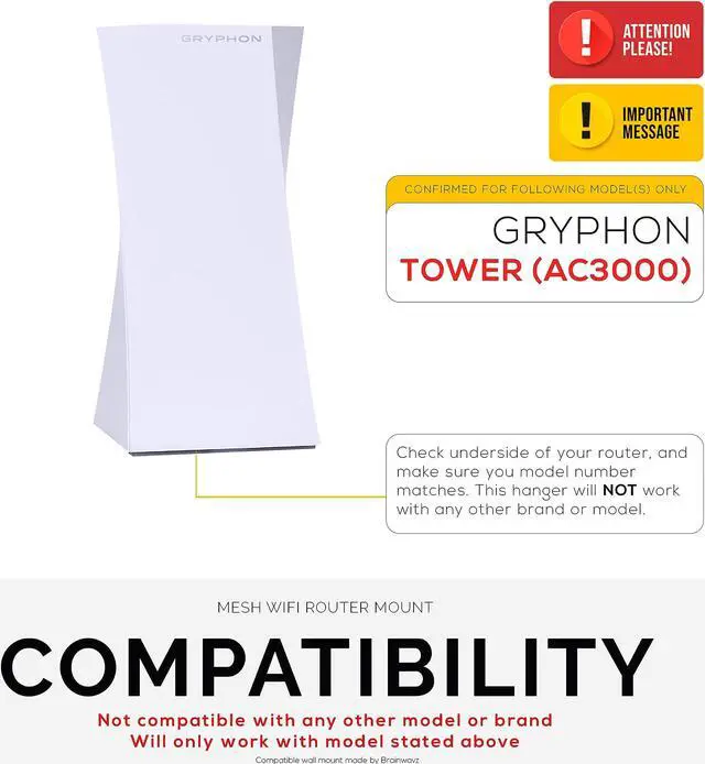 WALL MOUNT FOR BETTER WIFI: Get the most from your Mesh Router system by placing it higher up on your wall for maximum range and reception. When left on tables, the low level doesnt provide for the ideal situation for your router to reach its full potential. This product is manufactured and designed by Brainwavz, this product is compatible with Gryphon Tower AC3000 Mesh WiFi Router only.