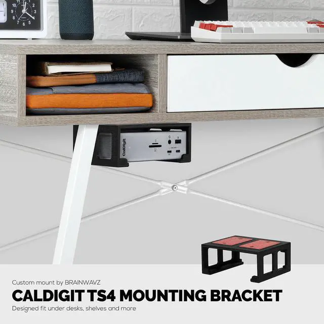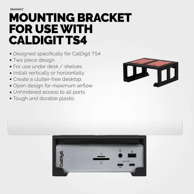 UNDER DESK BRACKET MOUNT: Under Desk Mounting Bracket suitable for Caldigit TS4 Thunderbolt 4 Dock is an ideal space-saving solution for home and office. This bracket can be used both vertically or horizontally, and mounts easily with the included 3M tape and screw pack. Get a clutter-free work setup while taking advantage of the full range of features that Caldigit's TS4 Dock provides. This product is manufactured and designed by Brainwavz, this product is compatible with CalDigit TS4 Dock ^^