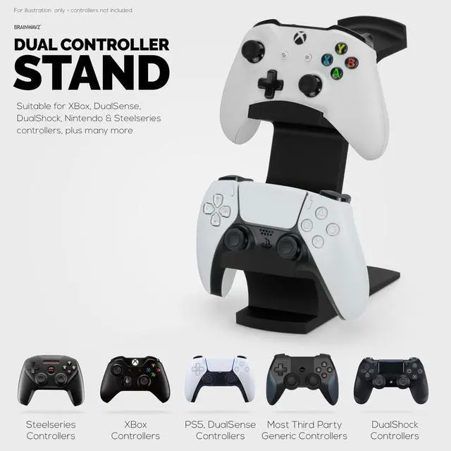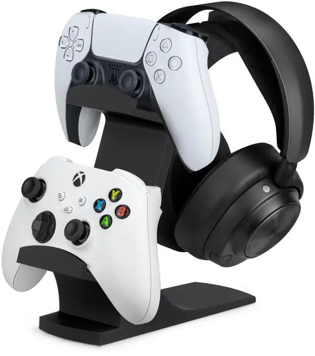 DESKTOP GAMING ORGANIZER: Striking and stylish gaming hanger, perfect accessory for any serious gaming setup. Sits on the desktop and holds 2 controllers and a headset, perfect for PS5, XBOX SERIES X, PS4, ONE, SWITCH, PC gamers, console gamers, DualSense, Nintendo & more. Can work with any gamepads, past present and future.