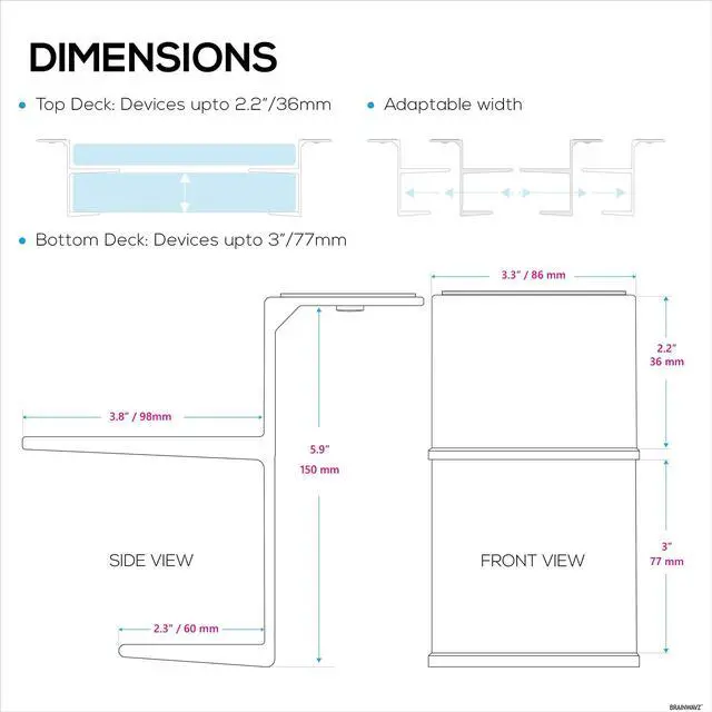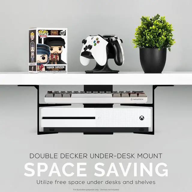 & BOTTOM UPTO 3: Upper layer having 2.2 of height, with the lower layer accommodating items up to 3 thick. Stack two devices to maximise your space, and enjoy the practicality of having them both in one convenient spot. ^^ DUAL UNDER DESK LAPTOP & DEVICE HOLDER & MORE: Suitable for small computers, laptops and almost any device that is less than 3" thick, this includes Cable box, Modems, Wi-Fi Routers, Nintendo Switch, Slimline Games Consoles, Smart TV Boxes, Streaming Devices, Files, Folders & MORE! ^^ Z DESIGN ^^ REAR BRACKET ^^