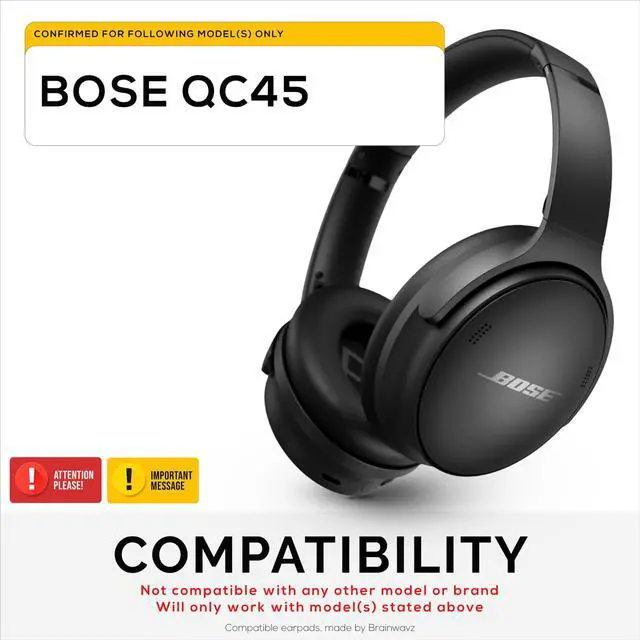 REPLACEMENT EARPADS FOR BOSE QC45: Designed for Bose QuietComfort 45 (QC45) headphones. Easy to install, made with better, long lasting materials than the stock Bose earpads. They will not fit any other brands or models. Please double check the model of your headset. These are compatible earpads, manufactured by Brainwavz. ^^