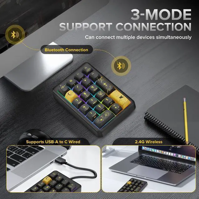 Easy to operate: In Bluetooth mode, The mechanical numpad press and hold FN+1, or FN+2 or FN+3 to activate open Bluetooth channel. Select different Bluetooth channels for different devices ^^ Hot Swappable Neptune KeyswitchBluetooth number pad adopts the Neptune switch from TTC, which is smoother, more stable and transparent. 41gf trigger pressure, 2.0 mm quick trigger, suitable for office financial keyboard. Supports full key hot swapping ^^ Not just a keyboardThere are also 22 RGB lighting effects, adjustable with 5 levels of backlight brightness, and can also change according to musicExperience colourful lighting effects at every moment ^^ Rechargeable 800mAh Batterykawaii keyboard is equipped with an 800mAh lithium battery that can be recharged for use. This numeric keypad can last for 7 days with lights on and 10 days without lights on ^^ 5-sided Sublimation PBT KeycapsThe pink keycaps numpad are made using a 5-sided sublimation process, with bright and long-lasting colors, delicate and clear patterns, and will not fade. It has excellent oil resistance and wear resistance