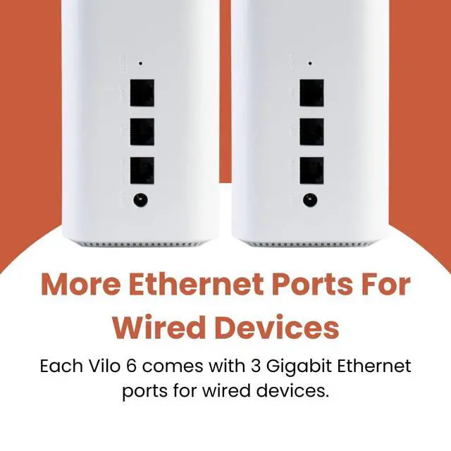 WI-FI 6 MESH SYSTEM (AX1800) - Supports gigabit bandwidth plans, Wi-Fi 6 devices, and IPV6 for a future proof network. ^^ THREE (3) GIGABIT ETHERNET PORTS, WPA3 security for safer home networks, and Smart Queue Management for optimized performance. ^^ SMART WI-FI FOR YOUR SMART HOME - Eliminate wi-fi deadzones and get seamless whole-home wi-fi coverage. Vilo 6 covers up to 2000 sq ft per unit, 4000 sq ft per 2-pack, and connects up to 128 devices per unit. ^^ FREE BARK IN-HOME PARENTAL CONTROLS - Enable free in-home network parental controls from Bark for your Vilo network.