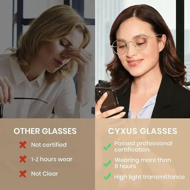 GLASSES MATERIAL:Cyxus blue light lens is made in lightweight metal frames and PC Lenses. Our PC crystal lens is 30% lighter than resin lens and 50% lighter than glass lens. At the same time, PC lenses are safer than glass lenses. Its impact resistance is 60 times that of glass lenses and through the falling ball impact test, the lens is no