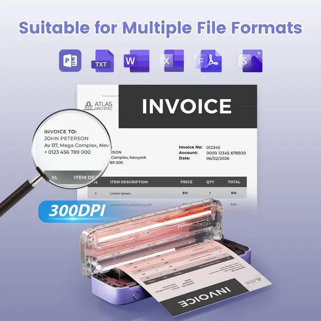 Adjustable Paper Sizes: This portable printer for smartphone comes with a roll of approximately 256 inches of thermal paper (about 22 A4 sheets) and supports US Letter/A4/4.33"/3.15"/2.09" thermal paper. You can print files in formats such as Word, Excel, TXT, JPG, etc. according to different sizes.