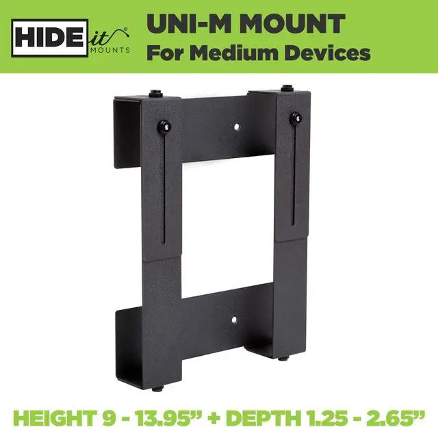 ADJUSTABLE FIT. The HIDEit Uni-M Wall Mount is adjustable to fit a variety of devices including cable boxes, satellite receivers, security DVRs and more! Check the device's dimensions to ensure a snug fit. Height: 9.01-13.95", Length: 6-14", Depth: 1.25-2.65".