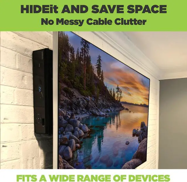 HIDEit AND SAVE SPACE. Our Medium Device Wall Mount makes it easy to HIDE messy cords and mount bulky devices behind your wall-mounted TV! So, ditch your bulky media cabinet and mount your devices for a sleek home media setup!