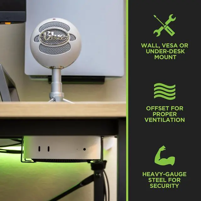^^ KEEP YOUR MAC MINI SAFE. Safeguard your Mac Mini from potential hazards like spills and accidental damage by securely mounting it out of harm's way. The offset wrap-around design provides a snug fit while promoting optimal airflow. ^^ INSTALLit IN JUST 3 EASY STEPS. No complicated templates or extensive tools required! Install in minutes with the included drywall screws and anchors; stud mounting is optional for added security. The package includes all necessary hardware for a quick and easy setup. ^^ AMERICAN COMPANY. Where your money goes matters. Your purchase of a HIDEit Mount helps support American small business and hundreds of additional American jobs.