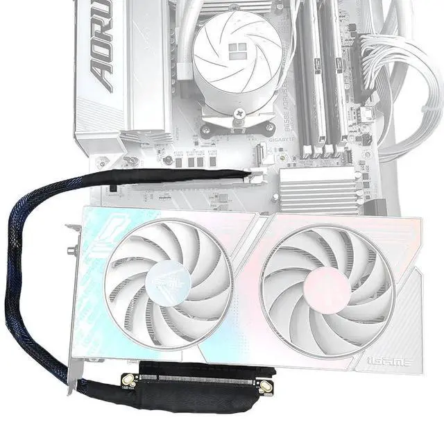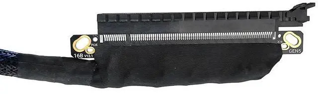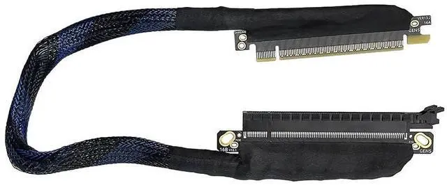 • PCIE 5.0 X16 graphics card extension cable, 64GB/S bidirectional bandwidth, 180 degree. Cannot be used to server motherboards that compatible with PRSNT signals, such as 5090.