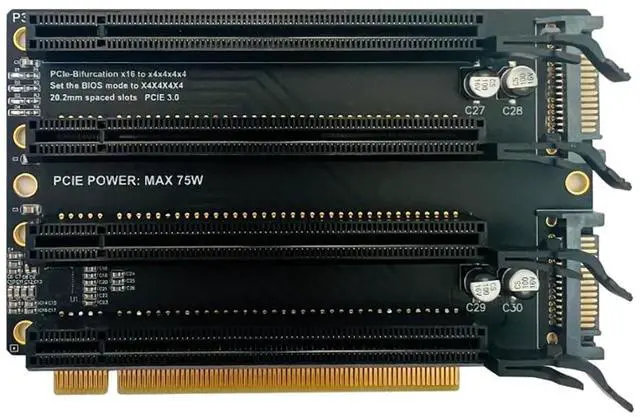 JMT PCI-E 3.0 x16 1 to 4 Split Card Gen3 PCIe-Bifurcation x16 to x4x4x4x4 Expansion Card 20.2 mm Spaced Slots SATA Power Supply PortPCIE X16 split X4X4X4X4X4, SATA powered version.