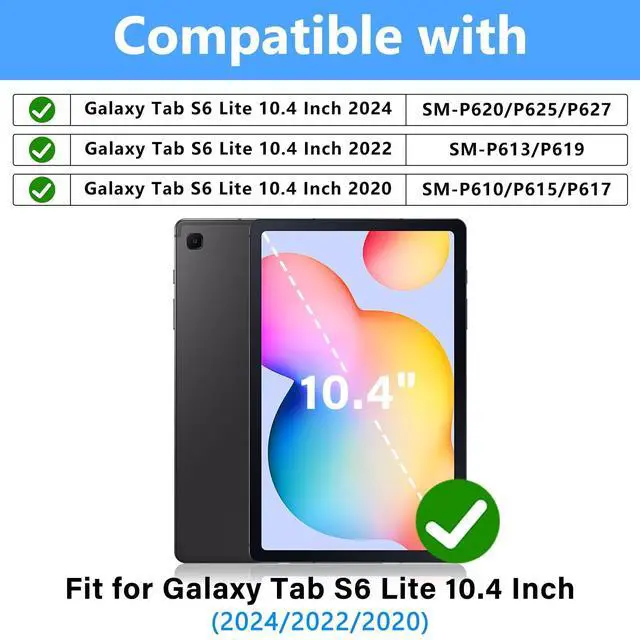 COMPATIBILITY Designed for Samsung Galaxy Tab S6 Lite 10.4 Inch 2024 Edition (Model SM-P620/P625) & 2022 Edition (Model SM-P613/P619) & 2020 Edition (Model SM-P610/P615/P617) Tablet. It will NOT work for any other model device ^^ [Advanced Silicone Material Enhanced Drop Protection] Upgrade shock-absorbing iPad silicone shell with Air-Guard corners and shock-absorbing silicone to protect iPad case from drop, shocks, impacts and scratches during hit against floor and daily use situation, ensure offer drop protection truly, also particle full around on silicone increase comfortable and anti-slip function when in use ^^ [3-Layer Full Body Protection with built in HD Screen Protector] Built in HD screen protector, enhance 3-layer construction design, unique super thick shock-absorbing iPad Case silicone shell exceed 2X Military Grade Drop Test Standard [MIL-STD 810G- 516.6 ], be sure to offer strongest protection, against any sudden drop, shock and knocks, safe for kids.