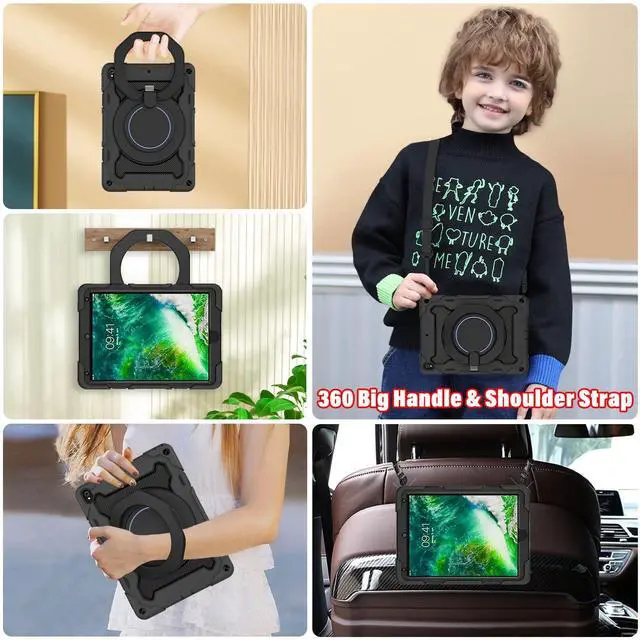 Release (Model: A1701 / A1709). NOT fits other model ^^ [Advanced Silicone Material Enhanced Drop Protection] Upgrade shock-absorbing iPad silicone shell with Air-Guard corners and shock-absorbing silicone to protect iPad case from drop, shocks, impacts and scratches during hit against floor and daily use situation, ensure offer drop protection truly, also particle full around on silicone increase comfortable and anti-slip function when in use ^^ [3-Layer Full Body Protection with built in HD Screen Protector] Built in HD screen protector, enhance 3-layer construction design, unique super thick shock-absorbing iPad Case silicone shell exceed 2X Military Grade Drop Test Standard [MIL-STD 810G- 516.6 ], be sure to offer strongest protection, against any sudden drop, shock and knocks, safe for kids. Additional built-in upgrade sponge technology adds extra heat-dissipation ^^ [Multiple angles of kickstand/Magic Kickstand & Handle] Upgrade 360 rotating and foldable kickstand provides angle between 20-75 degrees of horizontal (landscape) or vertical (portrait) orientation for your iPad tablet. Also offers hand hold and hung on wall using by handle function, allow you use or carry much easier, match up all kinds of group ^^ [Adjustable / Detachable Shoulder Strap & Pencil Holder] Equip with 59 inches adjustable and detachable shoulder strap assure no matter where you go, carry it up with maximum, totally relieve your hands, also can hung on the back seat in car, create a mini movie theater for your kids.