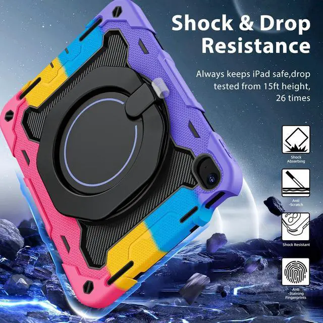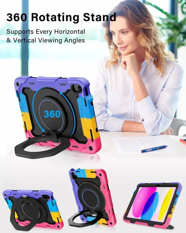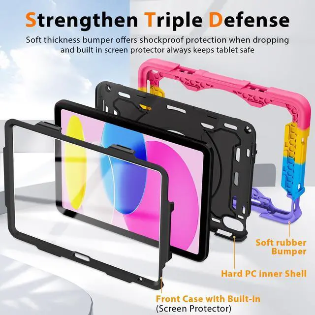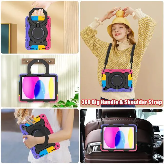 Fits iPad 11-inch (A1611th generation 2025 (Model: A3355, A3356iPad 10th generation 10.9 -inch 2022 (Model: A2696, A2757, A2777) ^^ [Advanced Silicone Material Enhanced Drop Protection] Upgrade shock-absorbing iPad 10th silicone shell with Air-Guard corners and shock-absorbing silicone to protect iPad 10th case from drop, shocks, impacts and scratches during hit against floor and daily use situation, ensure offer drop protection truly, also particle full around on silicone increase comfortable and anti-slip function when in use ^^ [3-Layer Full Body Protection with built in HD Screen Protector] Built in HD screen protector, enhance 3-layer construction design, unique super thick shock-absorbing iPad 10th/11th Case silicone shell exceed 2X Military Grade Drop Test Standard [MIL-STD 810G- 516.6 ], be sure to offer strongest protection, against any sudden drop, shock and knocks, safe for kids. Additional built-in upgrade sponge technology adds extra heat-dissipation ^^ [Multiple angles of kickstand/Magic Kickstand & Handle] Upgrade 360 rotating and foldable kickstand provides angle between 20-75 degrees of horizontal (landscape) or vertical (portrait) orientation for your 10.9 inch iPad 10th/11th tablet. Also offers hand hold and hung on wall using by handle function, allow you use or carry much easier, match up all kinds of group ^^ [Adjustable / Detachable Shoulder Strap & Pencil Holder] Equip with 59 inches adjustable and detachable shoulder strap assure no matter where you go, carry it up with maximum, totally relieve your hands, also can hung on the back seat in car, create a mini movie theater for your kids.
