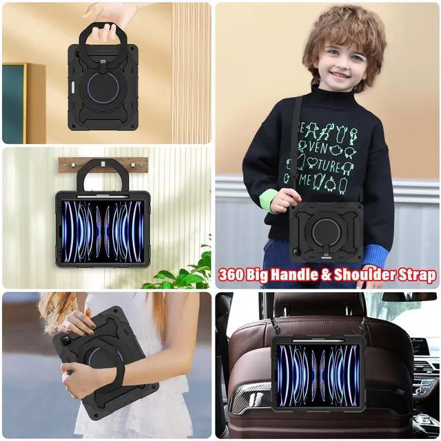 Pro 12.9 2018 3rd generation(model: A1876/A2014/A1895/A1895) ^^ [Strongest Style Kickstand] Only one type of iPad 12.9 inch full body shockproof rugged protective durable rubber case equip with big handle on back in the market, supports any viewing angles in horizontal and vertical orientation, easy to open / close the kickstand, that use it very much convenience for you and your kids and your family ^^ [Strongest Three Layer Shockproof Strong Protection & Built-in Screen Protector] Newest super thick super softer rubber part combines with rugged PC back cover and built in screen protector front frame, reinforce ten times shockproof impact resistance, meanwhile equip with super clear screen protector, work well on avoiding the screen of your iPad pro 12.9 breaking and scratching ^^ [Strongest 360 Rotating Kickstand Match Handle ] Multiple angles kickstand and handle are a favorite partner with all kinds of group, such as kids / man / women / student / workers / senior people / architect / designer / painting enthusiast / warehouse operator / money maker. Handle offer hold and hang it on wall function ^^ [Wireless Charging & Detachable Shoulder Strap] There is a Stylus Pen Holder to let your pencil charge & Equip with 59 inches adjustable and detachable shoulder strap, ideal for tour, restaurant order, household products introduce, engineer outside operation, teacher etc, shoulder strap can hung on the back seat in car, create a mini movie theater for your kids