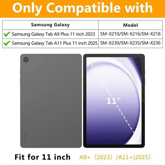 • for Samsung Galaxy Tab A11/A9 Plus Case Compatibility- Designed for Samsung Galaxy A11 Plus 2025(Model: SM-X230/SM-X235/SM-X236), Samsung Galaxy A9 plus 2023(Model: SM-X210/X216/X218)