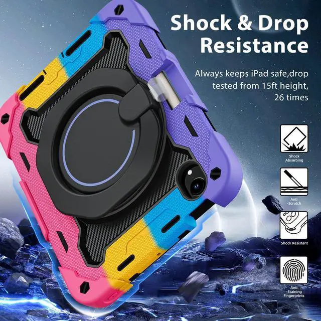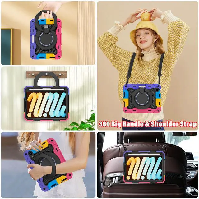 Mini 6 8.3 inch (Model: A2996/A2995/A2993/A2569/A2568/A2567) 2024/2021 release. Please confirm your iPad model before purchase ^^ [Advanced Silicone Material Enhanced Drop Protection] Upgrade shock-absorbing iPad silicone shell with Air-Guard corners and shock-absorbing silicone to protect iPad case from drop, shocks, impacts and scratches during hit against floor and daily use situation, ensure offer drop protection truly, also particle full around on silicone increase comfortable and anti-slip function when in use ^^ [3-Layer Full Body Protection with built in HD Screen Protector] Built in HD screen protector, enhance 3-layer construction design, unique super thick shock-absorbing iPad Case silicone shell exceed 2X Military Grade Drop Test Standard [MIL-STD 810G- 516.6 ], be sure to offer strongest protection, against any sudden drop, shock and knocks, safe for kids. Additional built-in upgrade sponge technology adds extra heat-dissipation ^^ [Multiple angles of kickstand/Magic Kickstand & Handle] Upgrade 360 rotating and foldable kickstand provides angle between 20-75 degrees of horizontal (landscape) or vertical (portrait) orientation for your iPad tablet. Also offers hand hold and hung on wall using by handle function, allow you use or carry much easier, match up all kinds of group ^^ [Adjustable / Detachable Shoulder Strap & Pencil Holder] Equip with 59 inches adjustable and detachable shoulder strap assure no matter where you go, carry it up with maximum, totally relieve your hands, also can hung on the back seat in car, create a mini movie theater for your kids.