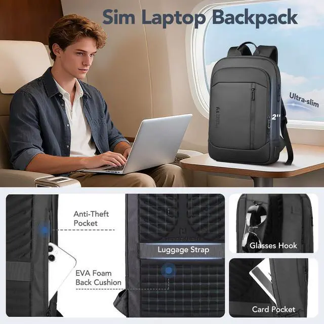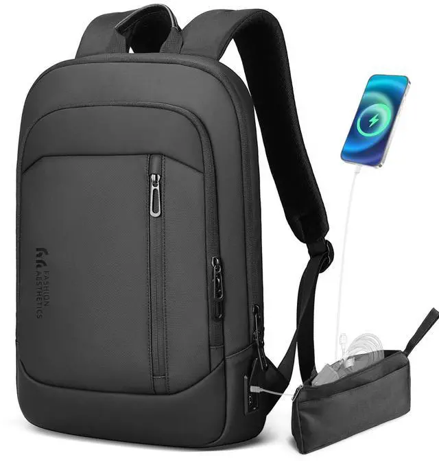 Simply connect your own power bank (not included) for hands-free, on-the-go charging, perfect for business, university, and travelers. ^^ Smart Organization with Hidden Anti-Theft Pocket --this laptop bag features: A main compartment with multiple functional pockets, including laptop sleeves, mesh pockets, pen slots, and card pockets. A front utility pocket for charging cables, keys, earbuds, or cards. A hidden anti-theft zipper pocket for valuables. A front waterproof zipper pocket for small things. Everything stays neatly organized and easy to find in the ultra thin computer bag, making it perfect for work and travel. ^^ Comfortable, Durable & Water Resistant - This mens business bag is made of water-resistant 1800D Oxford fabric, this slim waterproof backpack protects your laptop and gear from rain, splashes, and spills. The shoulder straps use breathable sponge mesh, offering soft cushioning and excellent airflow to reduce shoulder stress during long periods of wear. The backpack for electronics is designed with an ergonomic EVA back panel to provide firm structure, airflow, and superior comfort. ^^ Slim Profile, Stylish Look - With its clean lines, matte texture, and minimalist design, this men's business backpack pairs perfectly with office wear or travel outfits. Its sleek profile fits tight spacesunder airplane seats, in lockers, or beside your deskmaking it an excellent choice for business professionals, commuters, and university.