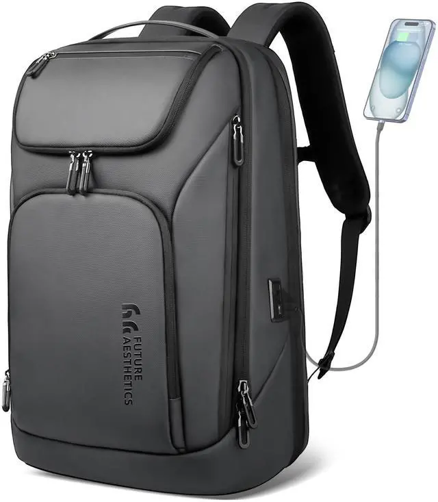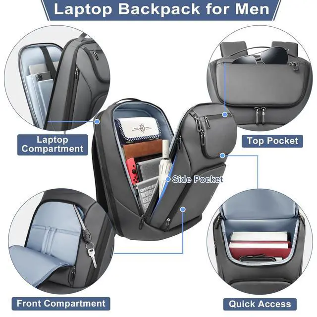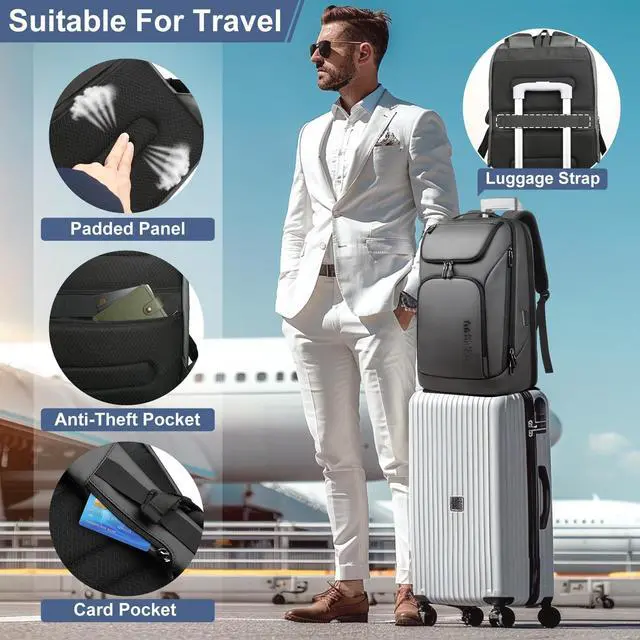 (PS: The power bank is not included! ) ^^ Comfortable, Durable & Practical Backpack The professional backpack for men has a breathable sponge mesh design, adjustable shoulder straps, with comfortable airflow foam-pad back design, offer your back maximum back support, and relieves the stress of your shoulder. The simple backpack has PU top handle for a long time carry on. ^^ LightWeight & Large Capacity Backpack The size of the laptop backpack men is, 17.7 x 11.8 x 9 Inches, it is a Lightweight Backpack for travel, only 2.6 lb. The mens work backpack has larger roomy compartments, which provide separate space for a computer, iPad, A4 files, wallet, clothes, power bank, and more items. ^^ Multi-Use The professional backpack for men can be used as a waterproof laptop backpack, High-tech backpack, carry-on backpack, luggage backpack for travel, carry-on backpack, 30L travel backpack, best laptop backpacks, outdoor backpack, and casual daypack. The slim charging bagpack, is perfect for business traveling, weekend getaways, shopping & outdoor activities for daily life.