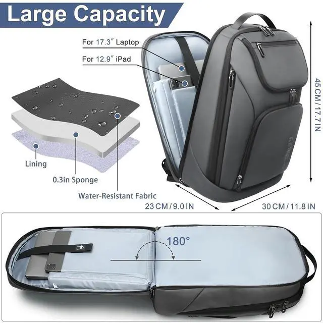 Original & Human Design by the brand hk The Business Laptop Backpack is a new backpack for men, especially for business. The mens backpack is made of high-density coated oxford material with metal zippers, which is waterproof, anti-scratch, and dustproof. The best carry-on luggage backpack is sturdy and solid. ^^ 180 Opening Laptop Compartment The black backpack has 5 pockets, the travel backpack for men can be opened at 180 and hold a 17.3 -inch laptop/Computer with a 12.9 -inch iPad. The front pocket can be used for casual shoes, clothes, magazines, and personal belongings.