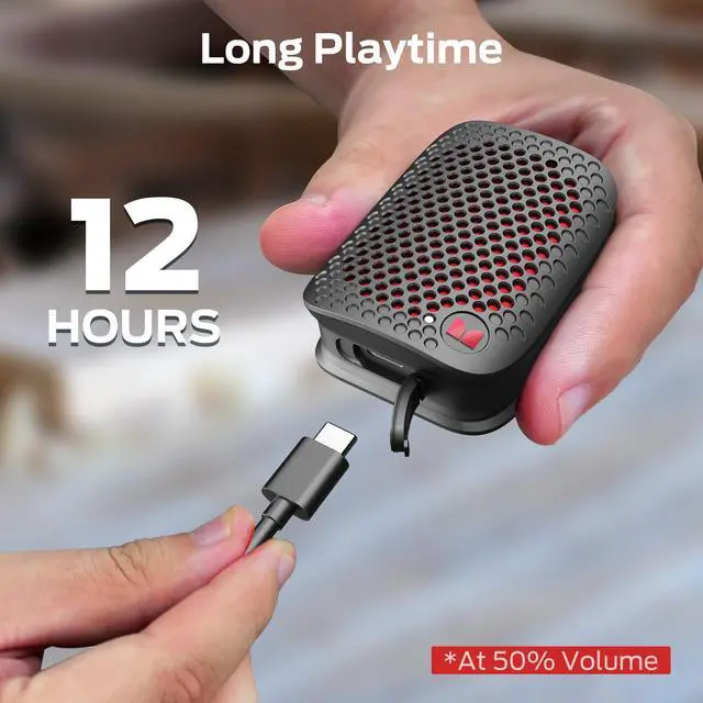 ^^ TWS Pairing Elevate your listening experience with Monster BLASTER MICRO's True Wireless Stereo (TWS) pairing capability. Connecting two speakers wirelessly to create a truly immersive stereo sound, allows you to experience richer, more dynamic sound. ^^ Extended Battery Life Enjoy up to 12 hours of playtime on a single charge. This wireless Bluetooth speaker is your steadfast companion for all-day listening, ensuring your tunes keep pace with your day, no matter how long it lasts. ^^ IPX7 Waterproof Monster clip on speaker boasts an IPX7 waterproof rating, offering robust protection against water.