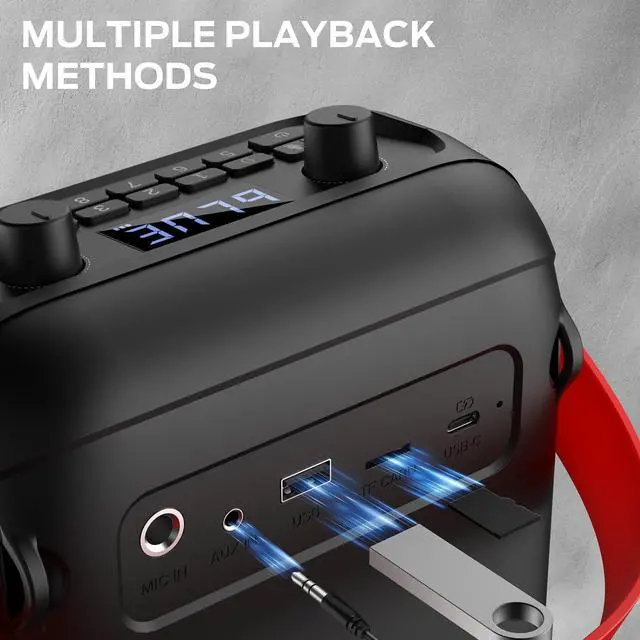You can even plug in a USB drive and directly play your favorite music files through the buttons. This versatility means that you can easily switch between devices and sources, and never have to sacrifice your music-listening experience due to device compatibility issues. ^^ Long Battery Life -- Get ready to enjoy uninterrupted music for all-day use with our long battery-life speaker. This portable Bluetooth speaker is powered by a high-capacity lithium-ion battery that allows up to 12 hours of continuous playback time on a single charge, without worrying about charging your bluetooth speaker frequently.