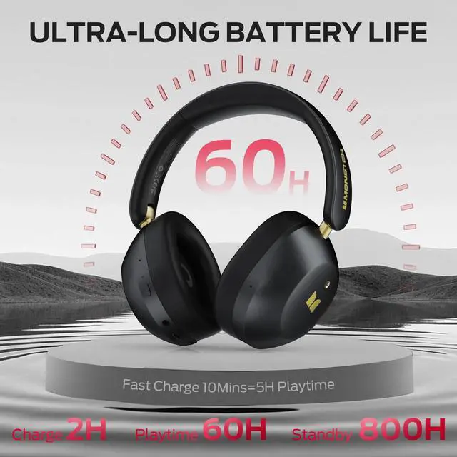 Or enjoy a balanced, classic sound with the standard mode for everyday listening. Perfect your auditory experience. ^^ 60H Battery LifeMonster Persona over ear headphones feature an industry-leading 60-hour battery life, engineered for relentless practicality. With the advanced rapid-charge technology, a mere 10-minute charge delivers an impressive 5 hours of uninterrupted playback. This exceptional endurance ensures the audio experience remains seamless across extended journeys and demanding workweeks, eliminating the anxiety of a depleted battery. ^^ Premium ComfortMonster Persona wireless headphones are engineered for supreme, all-day comfort. They feature plush, slow-rebound thickened memory foam earcups that gently conform to the unique contours of the head, effectively alleviating pressure points.