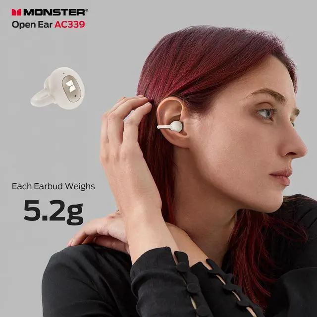Premium Audio & Extreme Comfort These open-ear earbuds provide an extremely comfortable wearing experience with their clamp-over design, ensuring a snug fit without added pressure. Paired with high-quality audio, they deliver clear and immersive sound, making every listening session enjoyable and effortless. ^^ Multi-Function Touch Control Monster Open Ear AC339 is specially designed with simple button control function, allowing you to easily switch between answering and hanging up calls, voice assistant, controlling music and managing other functions with just a touch. Whether you are driving, exercising or running, this provides great convenience and safety.