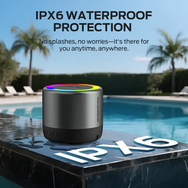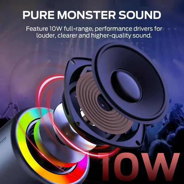 Pure Monster Sound & 10W Powerful Audio Monster's unique pure sound technology, perfecting every frequency for pure, distortion-free audio, that delivers Monster's signature sound quality. Now, the latest mini Bluetooth speaker delivers 10W of explosive power, fill the entire room or outdoor space with clear details, bringing a truly immersive listening experience. The advanced stereo sound field creates a true 360 immersion, allowing every beat to revolve around you. ^^ Bluetooth 6.0 & TWS Pairing Monster small speaker features the latest Bluetooth 6.0 technology, offering ultra-fast pairing, stable connections, and seamless audio streamingwith low latency or interruptions.