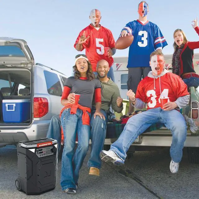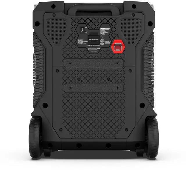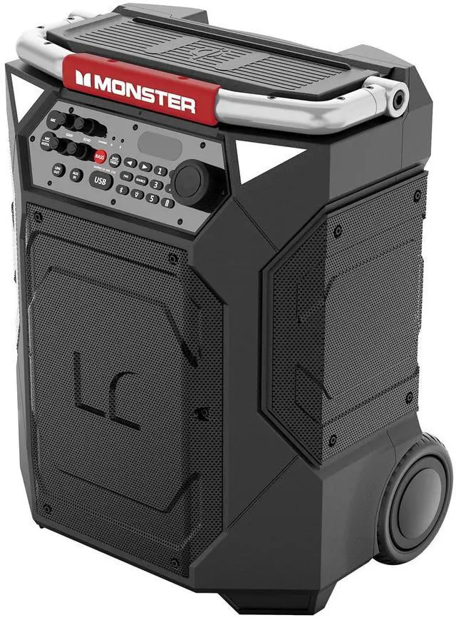 ^^ THE COMPLETE PACKAGE: Rugged oversized 5" wheels, to help with rough terrain. Adjustable top handle to allow for a phone or tablet to position upright. Built-in LED lighting to help view the controls as the lights go down and a telescoping handle for transportation. The Monster Rockin Roller 360 also features QI Wireless charger, a USB port, and includes a microphone for Karaoke/PA Speaker use.
