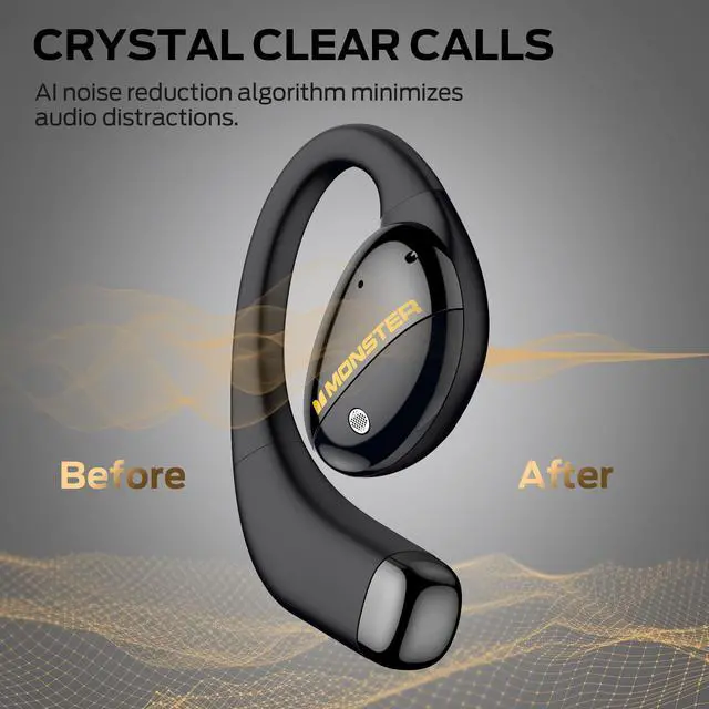 Whether on a long journey or during a busy workday, the Bluetooth headphones keep you powered up and enjoying your favorite tunes. ^^ IPX6 Water Resistance-With an IPX6 water resistance rating, the Monster wireless earbuds are built to withstand sweat and rain. Whether youre hitting the gym or braving a rainy commute, you can stay focused on your activities without worrying about water damage. ^^ Advanced Bluetooth 6.0 -Equipped with the latest Bluetooth 6.0 technology, Monster bluetooth earbuds deliver a fast and stable connection. The wireless headphones ensure a low-latency listening experience, with audio and video perfectly synchronized and free from delay.