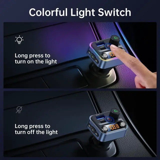 Humanized Rainbow Light SwitchIndulge in a delightful driving experience with our trendy rainbow light design of the FM transmitter car adapter. Immerse yourself in fun while having the convenience of easily turning off the light by long pressing the "b" button when unnecessary. Enjoy the captivating ambiance of the rainbow lights and have full control over your driving atmosphere. ^^ Enhanced Dual Mics & Superior Music StreamingWith Bluetooth 5.4 ensuring a solid connection, our transmitter adapter advanced dual mics coupled with Noise Suppression (CVC) technology and echo cancellation provide an outstanding hands-free calling and pristine music streaming experience.