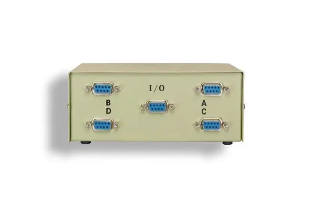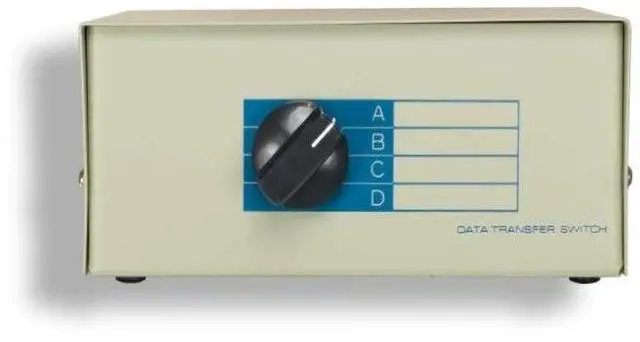 This DB9 manual data switch box can be used to switch between four computers to a peripheral device or one computer to four peripheral devices. Connectors are fully shielded for maximum EMI/RFI protection. Heavy-duty dial contorl switch knob. Anti-skid rubber feet. All lines are switched for total compatibility with all 9-pin connectors supplied. DB9 I/O female x 1 + ABCD female. Switch box does not require power. Cable may be required sold seperately.