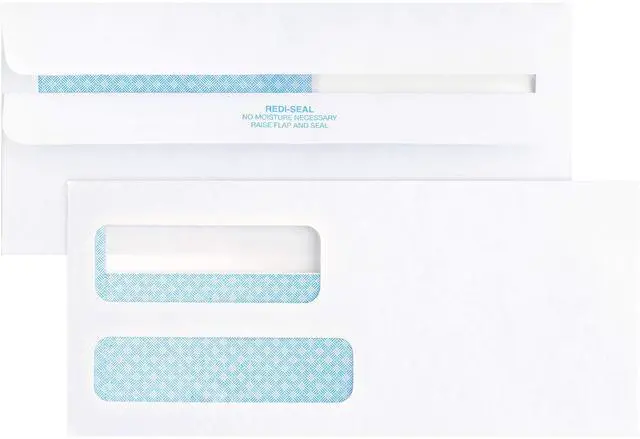 No. 9 invoice envelopes offer double windows for return address and mailing address. Compatible with most standard 8-1/2" x 11" computer-generated invoices and statements. The top window (1-3/16" x 3-1/2") is positioned 3/8" from left and 2" from the bottom of the envelope. The bottom window (1" x 4") is 3/8" from the left and 1/2" from the bottom. Poly windows and inside tint deliver privacy of contents. Self-sealing design makes them quick and easy to close. 24 lb. envelopes require no moisture to seal. Unique double flap design keeps the gum from sticking before use.