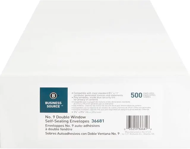 Business Source No. 9 Double Window Invoice Envelopes, Self Sealing (36681)