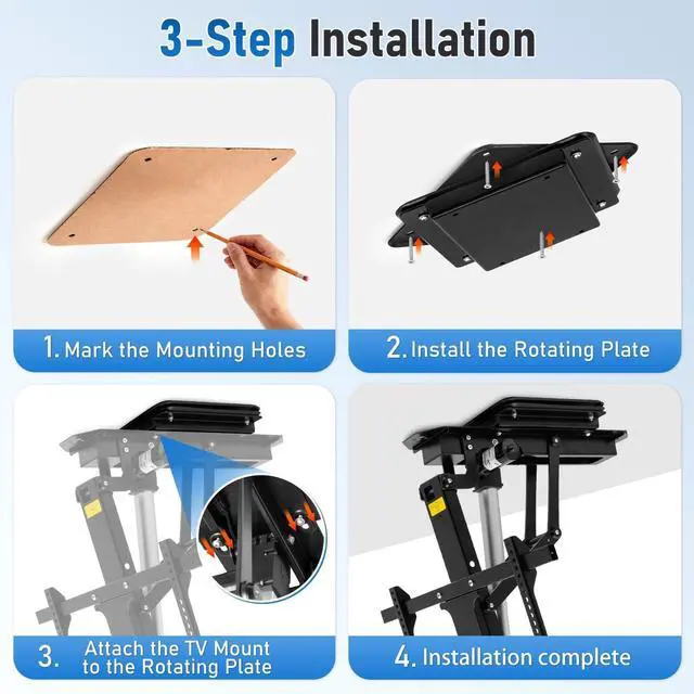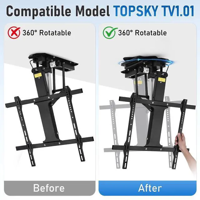 Mounting Pattern: Designed specifically for the TV 01.01 model, this turntable matches a 7.87" 7.87" mounting hole layout and includes detailed measurements (height 1.97", width 10.24", ) to ensure seamless installation. ^^ Heavy-Duty Steel ConstructionBuilt from durable, powder-coated steel, the rotation base delivers long-lasting rigidity and smooth turning performance. Its reinforced structure supports frequent angle adjustments without wobbling or bending. ^^ Complete Hardware Kit IncludedComes with everything needed for fast setup: turntable 1, ceiling template 1, concrete anchors 4, galvanized washers 4, M616mm screws 4, and ST 6.255 mm mounting screws 4. No additional parts required. ^^ Simple, Accurate InstallationThe included ceiling template ensures precise drilling alignment, reducing installation errors and saving setup time. Supports TVs up to 110 lbs and is compatible exclusively with the TOPSKY TV 01.01 ceiling TV mount, delivering a secure, plug-and-play upgrade