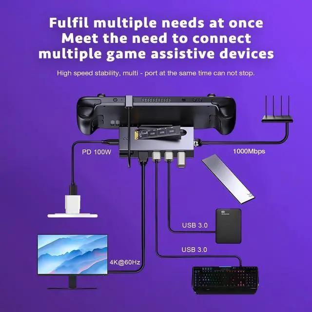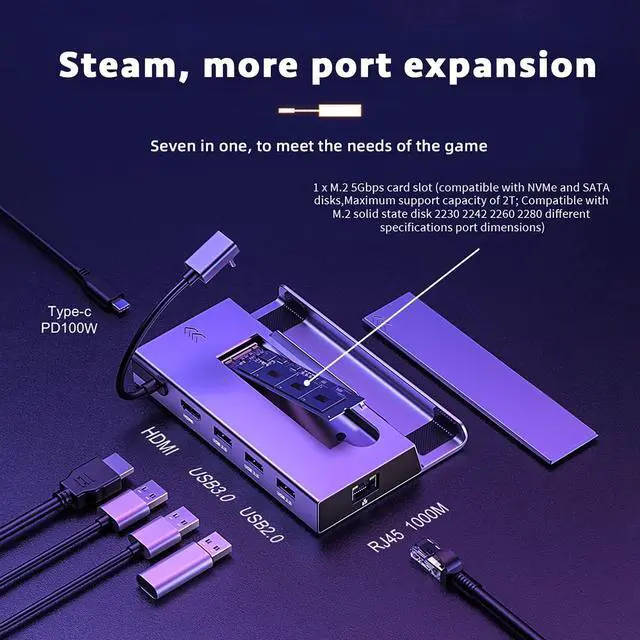 7 in 1 Multi-Functional7-in-1 Steam Deck Docking Station Designed for Steam Deck, this all-in-one docking station features an M.2 SSD slot, 4K@60Hz HDMI output, Gigabit Ethernet, USB-C PD charging port, two USB 3.0 ports and one USB 2.0 port, expanding your gaming setup instantly.
