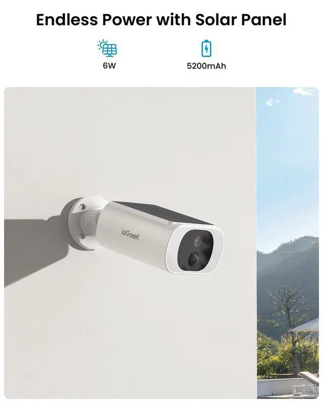 All in One Design, Zero Cable with Your SecurityIntroducing the new all-in-one ieGeek Solar Cam S1 that eliminates the need for a power cable and separate solar cable, drill one hole, once. This seamless design offers flexible installation for effortless setup, Tiny but mighty. ^^ Integrated Solar Panel, Endless Power from Solar EnergyIts innovative design includes a integrated solar panel that continuously charges the built-in battery. Just 2 hours of charging the solar panel in full sun is equal to 1 day of energy for the cameras for home security. Even when sunlight is insufficient, the built-in large-capacity battery is also sufficient to keep your solar security system running smoothly.